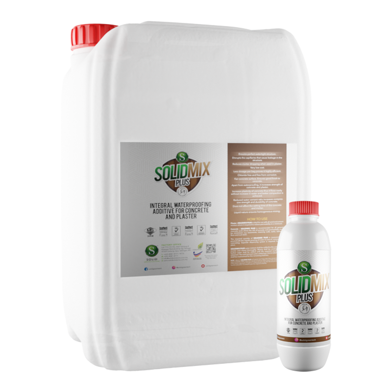SOLIDMIX PLUS is used to minimise permeability and porosity of concrete and cement sand mortar. Useful product for water retaining structures like terrace, water tanks, parapets, bathroom, toilets and industrial structures like reservoirs, cooling tower etc.