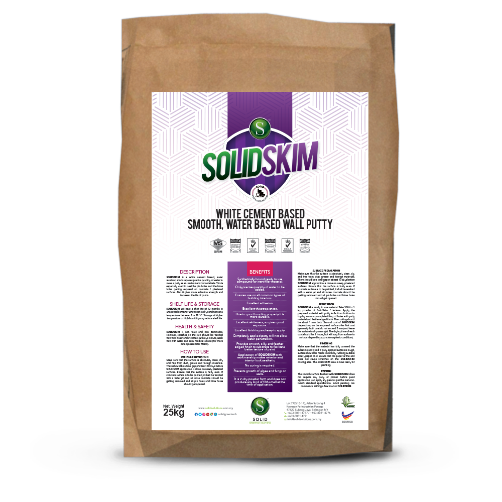 SOLIDSKIM is a white cement based, water resistant, which requires precise quantity of water to make a putty as an inert material for substrate. This is especially used to seal the pin holes and the blow holes getting exposed on concrete / plastered surfaces. Also it gives more adhesion strength and increases the life of paints.